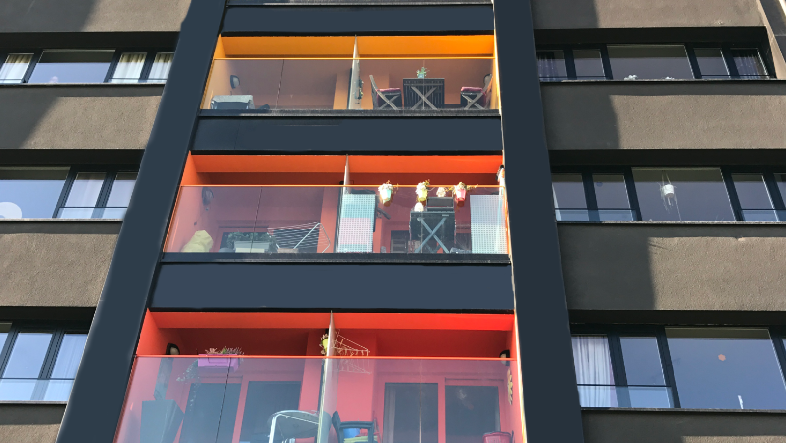 Om de woonbeleving van de bewoners te verbeteren werden de keuken en woenkamer opengetrokken tot een luchtiger geheel. De overdekte terrassen kregen een felle kleur dat terugkomt in andere facetten van het gebouw. Het kleurenspel geeft het zwarte gebouw de nodige pit en maakt elke wooneenheid bovendien uniek.