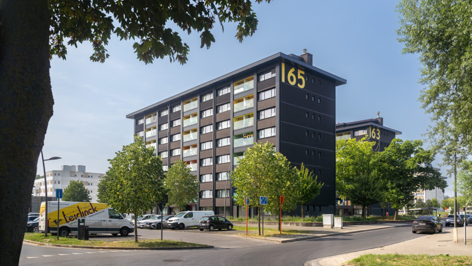 Dewaco investeerde in de renovatie van de blokken en stad Aalst pakte de buitenomgeving aan. Samen met stad Aalste brainstormden we uitgebreid over de invulling van het openbaar domein, alsook de gehanteerde kleuren en materialen. We verschoven de parkeerplaatsen naar de rand en lieten een groen en speelruimte ontstaan.