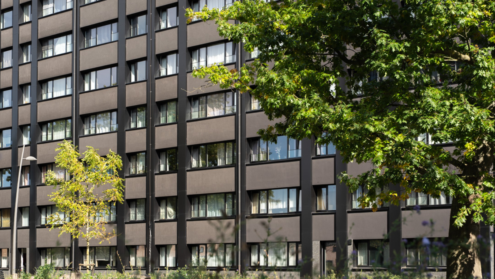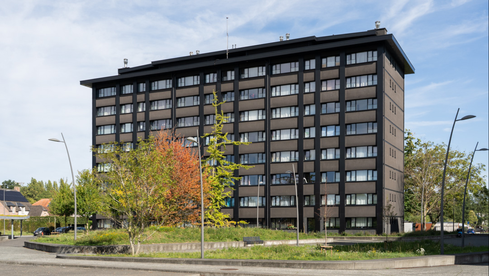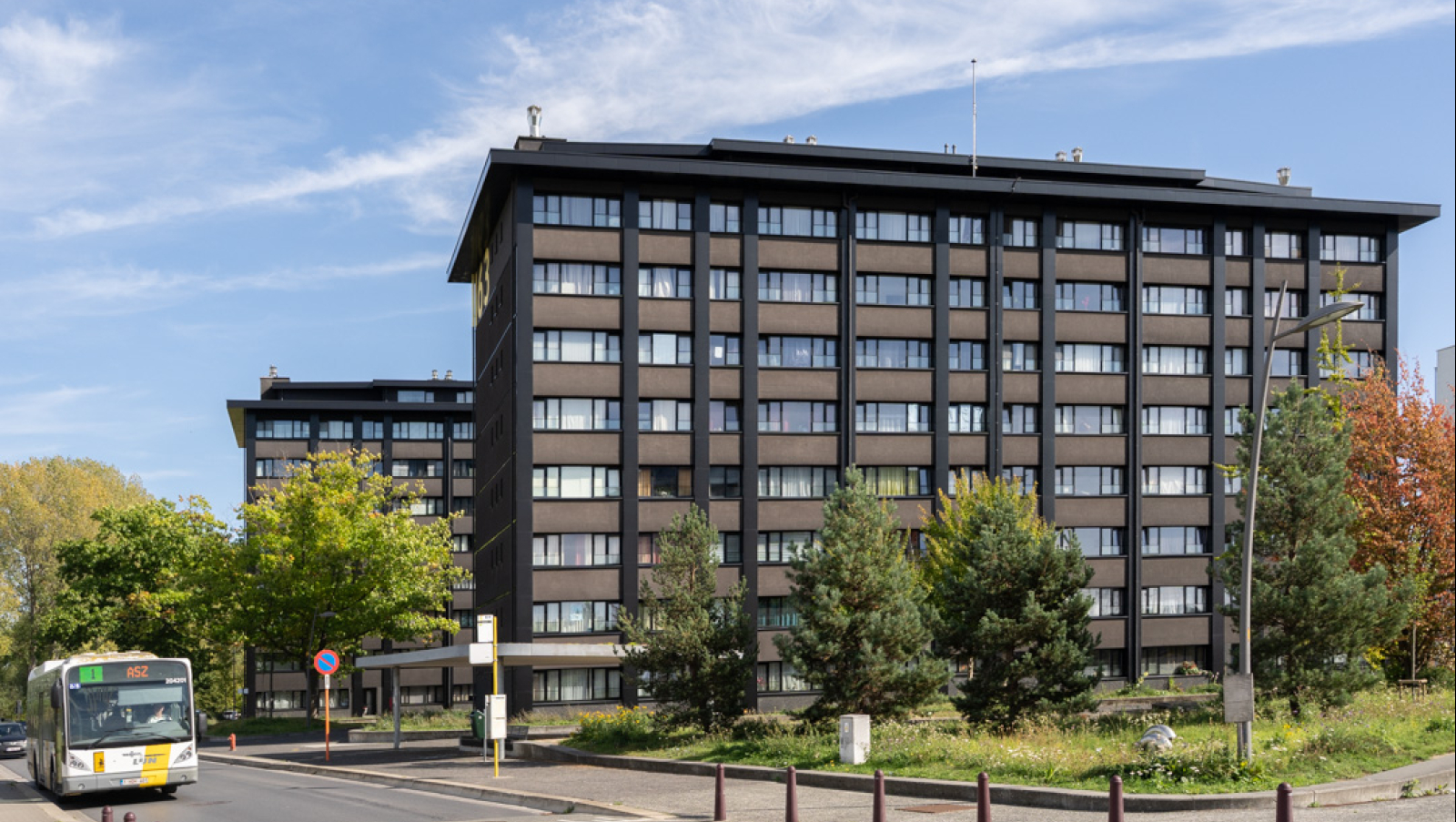 De gebouwen waren opgeleefd. Aan het uitzicht van het gebouw werd echter niets gedaan. Door een aantal eenvoudige ingrepen wensten we de blokken mooier en aangenamer te maken voor de gebruikers en de buurt. We hebben geopteerd om de gebouwen in te pakken met een zwarte en isolerende schil om zo verdere betonrot tegen te gaan. Een duurzame én esthetische oplossing.
